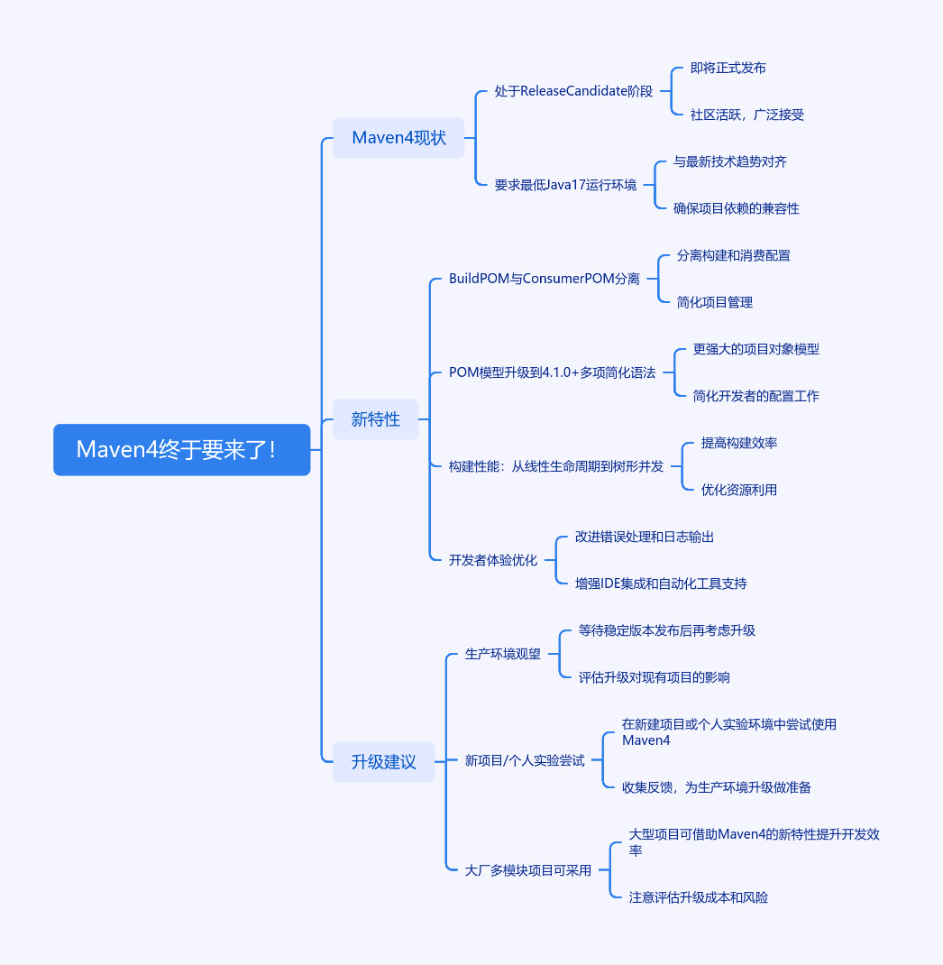文章介绍了Maven 4相关情况。目前Maven 4.0处于Release Candidate阶段,未正式GA。它要求最低Java 17运行环境,有诸多新特性:一是分离Build POM与Consumer POM,解决Maven 3发布元数据臃肿问题,发布artifact更干净,依赖解析快,生态兼容性好;二是POM模型升级到4.1.0,简化语法,如自动发现子项目、坐标推断、支持CI友好变量;三是构建性能提升,从线性生命周期到树形并发;四是优化开发者体验,有构建恢复、延迟发布、官方迁移助手等。对于生产环境建议等正式GA后小范围灰度,新项目/个人实验和大厂多模块项目可尝试。