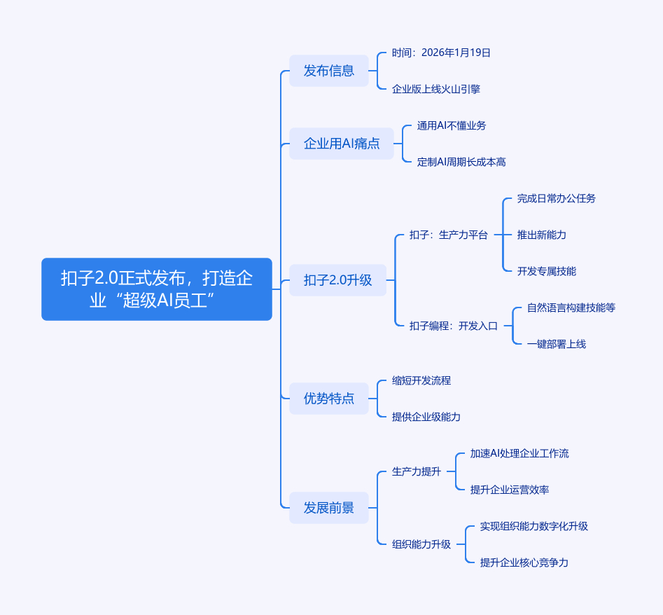 2026年1月19日,扣子2.0正式发布,企业版同步上线火山引擎。它旨在解决企业用AI的痛点,如通用AI不懂业务、定制AI周期长成本高。扣子2.0有两大升级:扣子是开箱即用的企业AI生产力平台,能完成写作、出图等日常办公任务,有新能力,企业可用自身数据开发专属技能;扣子编程是全员可用的AI开发入口,通过自然语言对话构建技能等,一键部署上线。它缩短开发流程,提供企业级能力,让最懂业务的人定义AI。Gartner预测2028年AI智能体将处理企业80%常规工作流,扣子正加速这一进程,让企业拥有超级AI员工,实现组织能力升级。