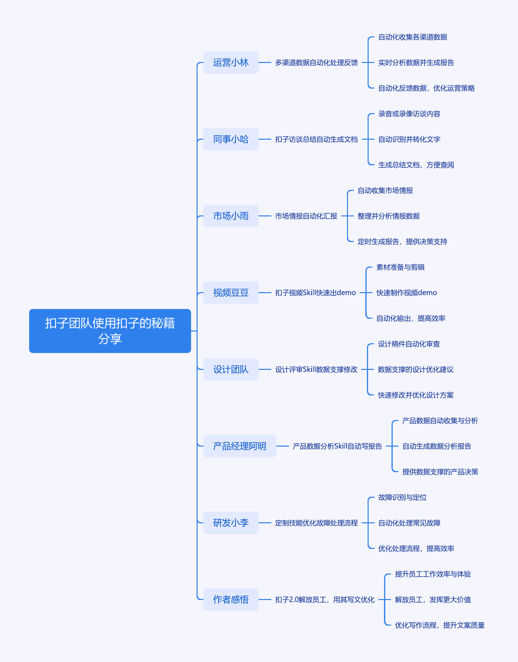 这是扣子刚入职小编的分享,借用户追问产品迭代速度,分享扣子团队使用扣子办公的技巧。如小林用「多渠道数据自动化」处理反馈,小哈用「扣子访谈总结」整理访谈,小雨用「市场情报自动化」获取竞品信息,豆豆用扣子视频 Skill 制作宣传片,设计团队用「设计评审」Skill 支撑设计评审,阿明用「产品数据分析」Skill 汇报数据,研发团队定制技能优化故障处理流程。作者认为扣子 2.0 企业版能让员工从繁琐工作中解放,还透露文章是用扣子所写并经其优化。