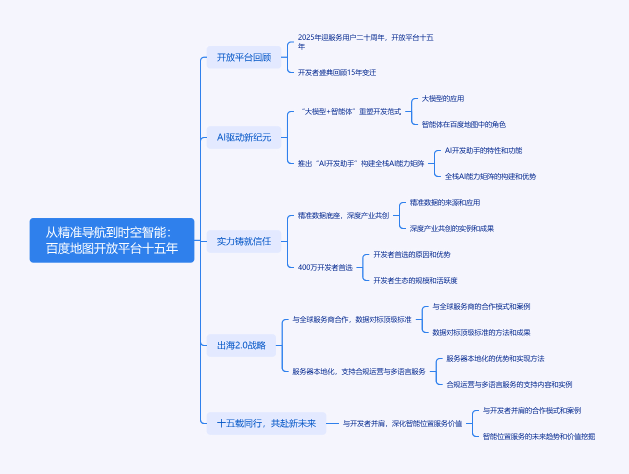 2025年百度地图服务用户二十周年,其开放平台也走过十五年。在“2025百度地图开发者盛典”上,回顾了从基础地图API到智能位置服务平台的变迁。百度地图开放平台以AI驱动,推出“AI开发助手”,构建全栈AI能力矩阵,深耕行业智能体。其靠精准数据底座、深度产业共创等成400万开发者首选。还启动出海2.0战略,与全球服务商合作,完成服务器本地化部署,支持合规运营与多语言服务。未来百度地图将以AI为核,深化智能位置服务价值。