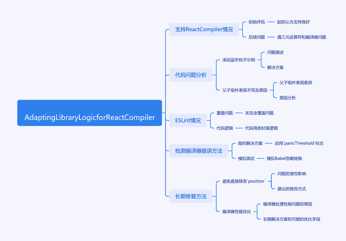 文章围绕适配 React Compiler 时的库逻辑展开。作者作为 TanStack Form 维护者,起初认为支持良好,后遇三元运算符和编译器问题。通过滚动监听钩子示例,揭示代码在父子组件中表现不同的问题,原因是 React Compiler 对 position 对象引用比较方式不同。ESLint 未完全覆盖此类问题,因代码用类封装逻辑以支持多框架。为检测编译器错误,可启用 panicThreshold 标志,还能模拟 Babel 忽略库转换。长期修复方法是避免直接修改 position,React Compiler 可处理性能问题。