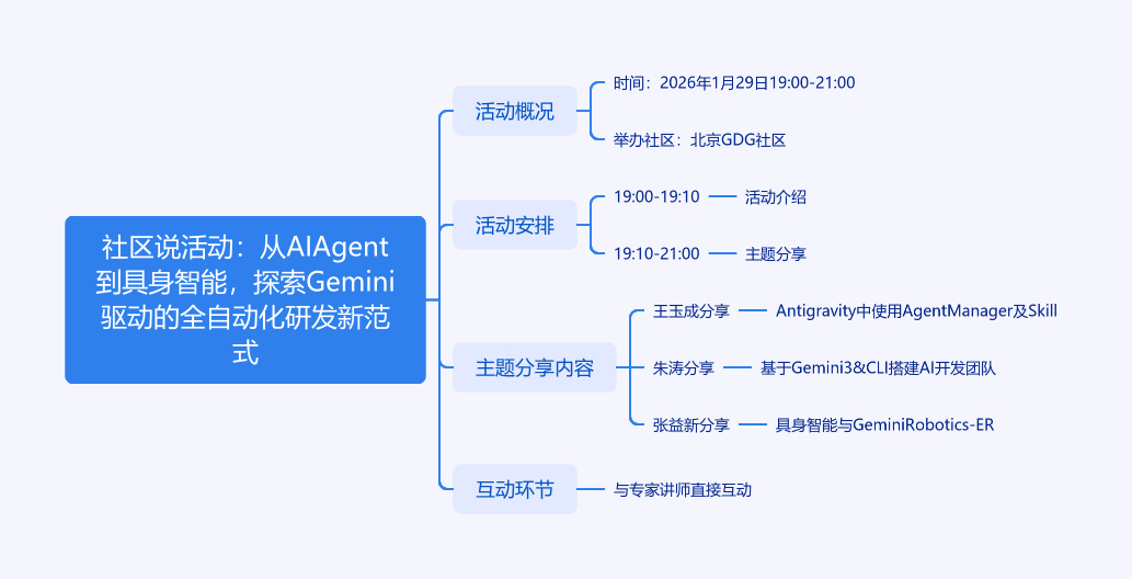 2026年1月29日19:00 - 21:00北京GDG社区举办“社区说”活动,探索从AI Agent到具身智能、Gemini驱动的全自动化研发新范式。活动先进行10分钟介绍,后有三场主题分享。王玉成剖析Antigravity框架下AI Agents架构与实践,助开发者掌握构建智能工作流关键;朱涛讲利用Gemini 3 & CLI搭建全天候虚拟研发军团,提升开发效能;张益新聚焦具身智能,拆解Gemini在该领域能力,解决感知决策执行闭环痛点。活动还安排与专家互动环节。