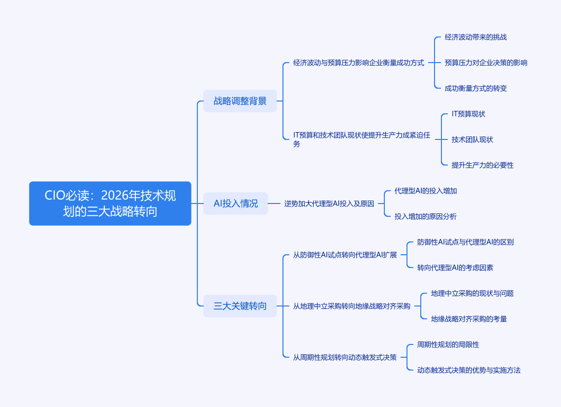 市场变化促使CIO调整技术战略。2026年经济波动和预算压力改变企业衡量成功的方式,IT预算小幅增长、技术团队扩张受限,提升内部生产力成CIO紧迫任务。即便预算紧缩,全球CIO和技术高管仍逆势加大AI投入,尤其是代理型AI,因其有技术创新和高投资回报潜力。基于2500位CIO的洞察,Gartner总结出2026年技术规划的三大关键转向:从防御性AI试点转向代理型AI扩展,从地理中立采购转向地缘战略对齐采购,从周期性规划转向动态触发式决策。