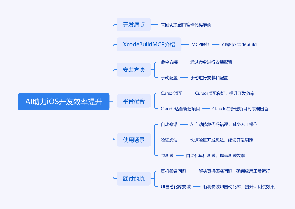 文章围绕 XcodeBuildMCP 展开,指出多数 iOS 开发者用 AI 编程助手时,代码编译需来回切换窗口是痛点。XcodeBuildMCP 作为 MCP 服务,能让 AI 直接操作 xcodebuild,使 AI 从仅帮写代码变为能跑代码。安装有环境要求,最快一行命令搞定,也可手动配置。它与 Cursor 配合最顺,Claude Desktop 适合从零创建 App 场景。还介绍常用场景,如自动修报错等,以及踩过的坑,像真机先配签名、UI 自动化要装 AXe。用它后 AI 辅助开发形成闭环。