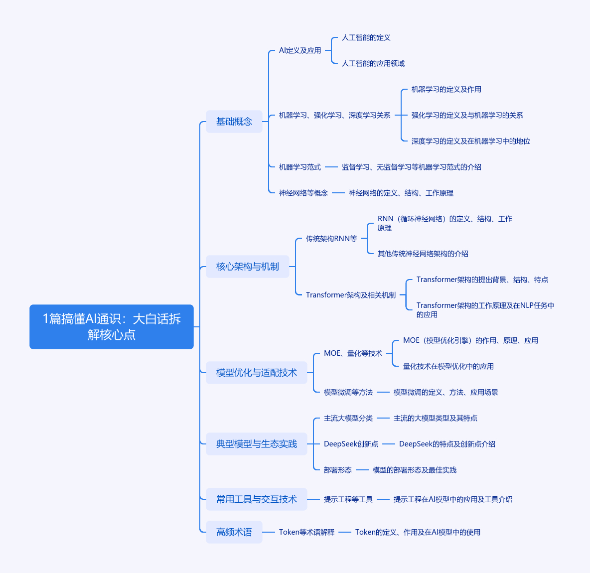 文章以通俗语言按“基础→核心→优化→落地→工具→术语”逻辑讲解AI通识。基础概念介绍AI及机器学习、深度学习等关系,还提及预训练、大模型等;核心架构阐述传统与现代架构,如Transformer及其相关机制;优化技术包括MOE、量化等使模型更实用;典型模型介绍通用与垂直大模型及DeepSeek创新;常用工具涉及提示工程等;高频术语解释Token、AGI等。最后总结AI核心是从数据找规律到落地实用。