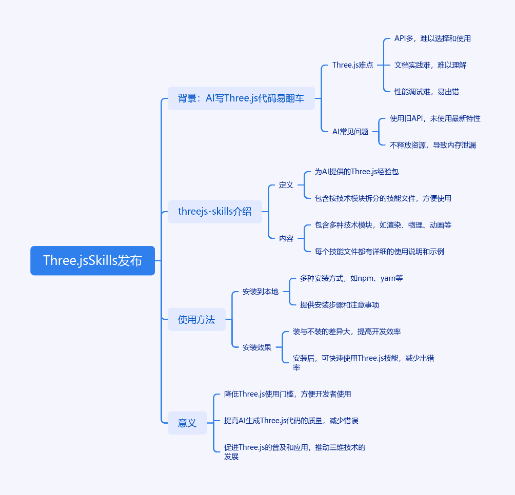 文章介绍了 threejs - skills,它是一套给 AI 用的 Three.js 经验包。因 Three.js 对前端难,AI 写其代码易翻车,如用不推荐 API、不释放资源等。threejs - skills 像 Three.js 的「避坑清单(AI 专用)」,按技术模块拆分,涵盖场景初始化、几何体、材质等内容。使用时可安装到本地,装与不装效果差异大,能让 AI 写代码更具工程思路、考虑性能和维护。它和 vue - skills 指向同一方向,降低了 Three.js 使用门槛,值得用 AI 写 Three.js 的人尝试。