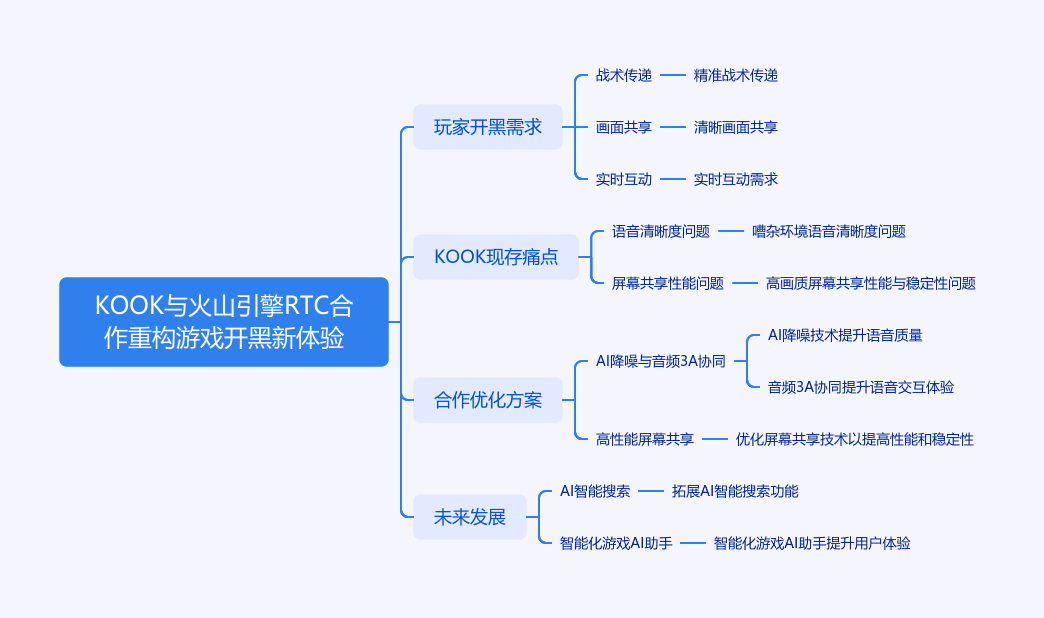 游戏玩家对开黑体验要求严苛,KOOK 与火山引擎 RTC 展开深度合作。KOOK 此前存在嘈杂环境语音不清晰和高画质屏幕共享性能不稳定两大痛点。双方针对痛点打造专属优化方案,AI 降噪与音频 3A 协同处理音频,实现零干扰纯净语音,高性能屏幕共享方案解锁 4K 超高清流畅体验。未来,双方将聚焦 AI 智能搜索和游戏 AI 助手应用,构建智能化游戏社区,推动游戏社交领域发展。