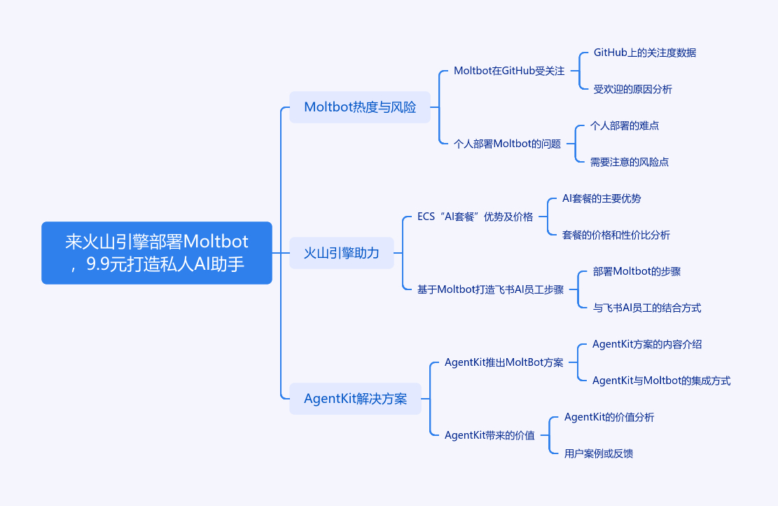 Moltbot是现象级开源AI Agent项目,热度上升,在GitHub获98k Star。个人电脑部署Moltbot有算力占用、硬件损耗和数据风险。为此,火山引擎云服务器ECS推出“AI套餐”,包月9.9元起,包年58元起。介绍了基于Moltbot打造专属飞书AI员工的两步部署方法,包括选购ECS、配置模型与飞书机器人。还提到火山引擎AgentKit将推出基于MoltBot的解决方案,有企业级安全管控、零配置负担等价值,可通过飞书指令让云端Moltbot自动完成任务。