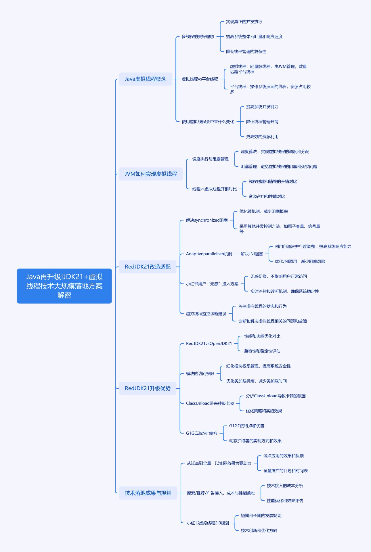 本文围绕 JDK21 + 虚拟线程技术在小红书的大规模落地展开。先介绍虚拟线程概念,对比其与平台线程,阐述 JVM 实现虚拟线程需解决的核心问题及调度、阻塞管理机制,还通过测试对比线程与虚拟线程开销。接着说明 RedJDK21 针对 Synchronized 阻塞、JNI 阻塞等做的改造,以及用户无感接入方案和监控诊断建设。然后提及 RedJDK21 相对 OpenJDK21 的改动及优势。最后讲述该技术落地成果,包括在多业务链路的性能优化,还规划了虚拟线程 2.0 在稳定性、可观察、灵活性方面的改进方向。