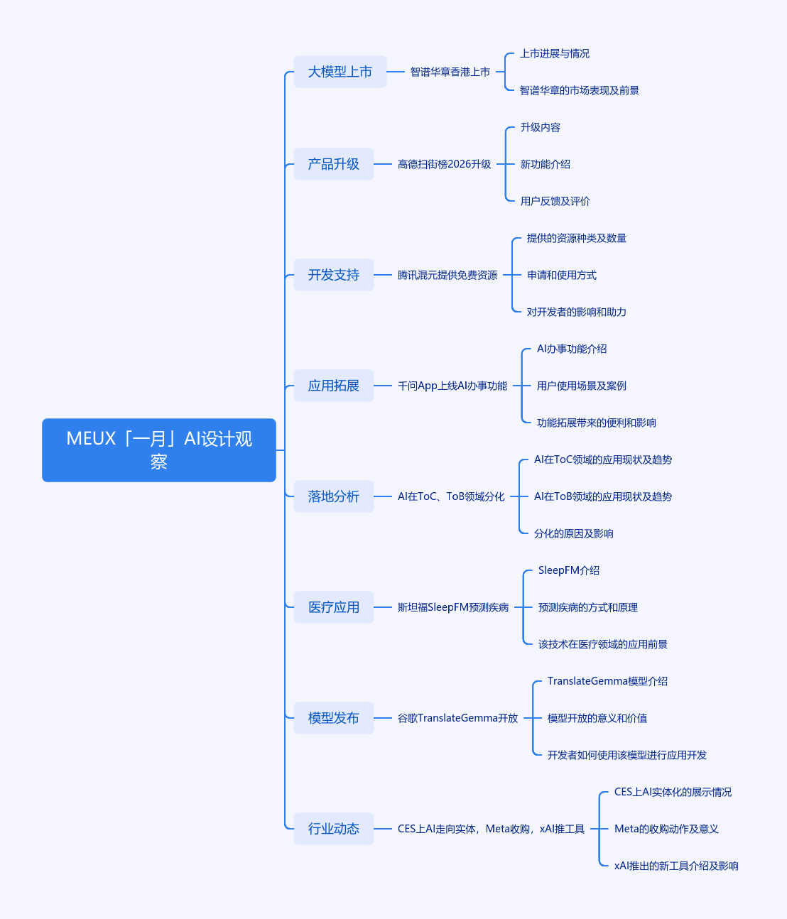 本文为MEUX「一月」AI设计观察,涵盖多则AI资讯。智谱华章成全球大模型第一股,上市首日表现佳;高德自研模型FantasyWorld登顶,扫街榜2026升级;腾讯混元给开发者免费资源;千问App上线AI购物等办事功能;腾讯姚顺雨称AI落地To C滞、To B兴;斯坦福SleepFM模型可预测疾病;谷歌推出TranslateGemma翻译模型;2026 CES上AI走向实体;Meta收购Manus;马斯克xAI推出Grok Build编程工具。