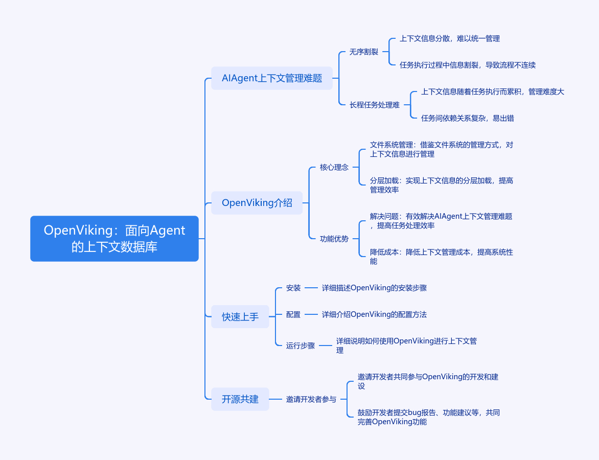 文章介绍了专为AI Agent设计的开源上下文数据库OpenViking。AI Agent发展中,开发者面临上下文管理难题,如无序割裂、长程任务处理难、检索效果局限等。OpenViking采用文件系统范式,将记忆、资源和技能统一结构化组织。其核心理念包括文件系统管理范式、分层上下文按需加载、目录递归检索、可观测与自迭代。它能解决碎片化问题、降低Token消耗、提升检索效果、使上下文可观测和自迭代。文章还给出三分钟上手步骤,最后呼吁开发者开源共建,定义下一代Agent上下文标准。