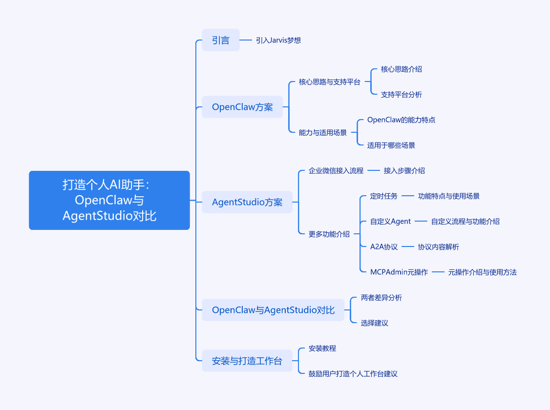 文章围绕打造个人 AI 助手展开,对比 OpenClaw 和 Agent Studio。OpenClaw 是成熟开源项目,支持多消息平台,适合技术团队搭建 Agent 基础设施。而 Agent Studio 定位为个人 Agent 工作台,以企业微信接入为例,展示 5 分钟完成接入流程,具有图形化配置优势。其功能强大,有定时任务、自定义 Agent、A2A 协议和 MCP Admin 元操作能力。相比 OpenClaw,Agent Studio 更聚焦本地和个人场景,代码开源,适合快速搭建个人 Jarvis,让用户打造适合自己的 Agent 工作台。