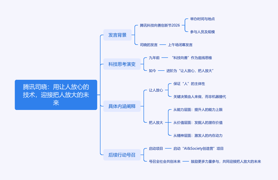2026年1月27日,腾讯科技向善创新节2026举办,腾讯集团副总裁司晓在上午场闭幕发言。他回顾九年前腾讯提出“科技向善”是底线思维。如今大模型、生成式AI爆发,技术有了“像人”一面,腾讯思考进阶为“让人放心,把人放大”。“让人放心”要保证“人”的主体性,关键决策人能介入。“把人放大”从能力、价值、精神三个层面展开,AI应延伸人的能力、放大价值、让人有更多自由。最后,腾讯研究院将启动“AI & Society创造营”,号召全社会共创,用放心技术迎接放大人类的未来。