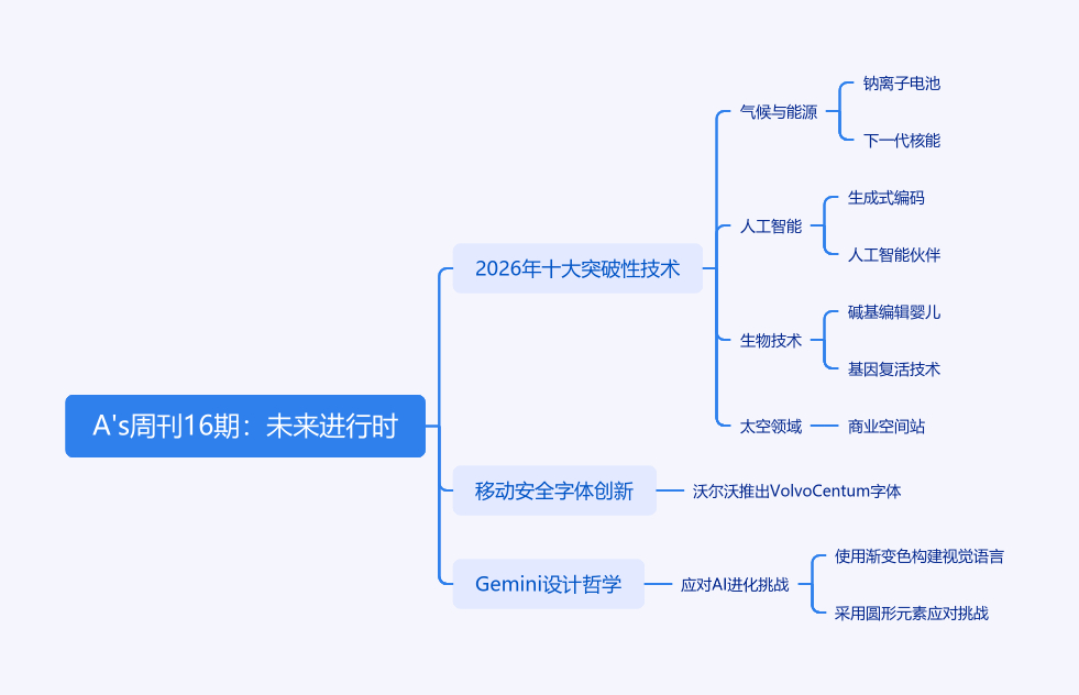A's周刊16期探讨科技趋势。一是《麻省理工科技评论》发布“2026年十大突破性技术”,涵盖气候与能源、人工智能、生物技术、太空领域,如钠离子电池、生成式编码等,展现未来科技图景。二是沃尔沃推出定制字体Volvo Centum,经专门工程化处理,提升阅读速度与驾驶安全性。三是Google的Gemini设计,因AI进化挑战传统设计一致性,团队用渐变色和圆形构建视觉语言,让产品直观、值得信赖。