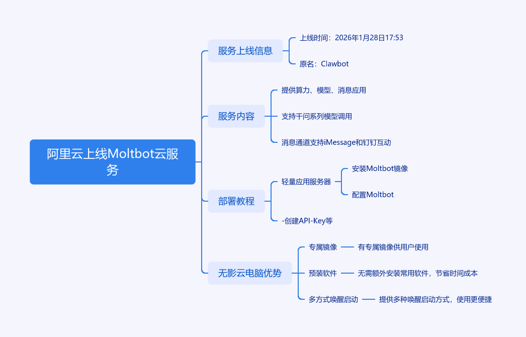 2026年1月28日17:53,阿里云正式上线Moltbot(原名Clawdbot)全套云服务,为Agent提供算力、模型和消息应用等。用户能在阿里云轻量应用服务器或无影云电脑快速启用,按需调用阿里云百炼上一百多款千问系列模型。消息通道支持iMessage,还能实现钉钉消息互动。云服务器部署教程:先在轻量应用服务器安装Moltbot镜像,再配置Moltbot,包括创建API - Key、放通端口、配置API Key、生成Token等。此外,阿里云无影云电脑上线内置Moltbot和应用软件的专属镜像,预装多种软件,支持多软件唤醒Moltbot,一键导入镜像可启动。