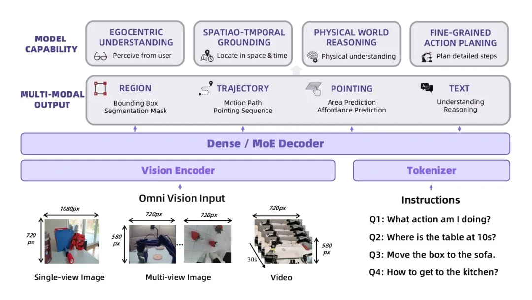 2026年2月10日,达摩院开源首个支持可移动操作的具身大脑基础模型RynnBrain。具身智能发展有两条技术路线,现有具身基础模型存在动态认知受限、有物理幻觉等问题。RynnBrain有关键要点:时空记忆、物理空间推理、良好可拓展性。实验显示其在多项具身任务基准测试中超越强大模型。该模型在Qwen3 - VL基础上训练,优化训练速度,支持多模态输入输出。其预训练有统一框架和特定训练策略,准备了多类数据。后训练包括物理空间推理、视觉语言导航、操作规划任务。实战中,基础模型能力全面,后训练潜力巨大。