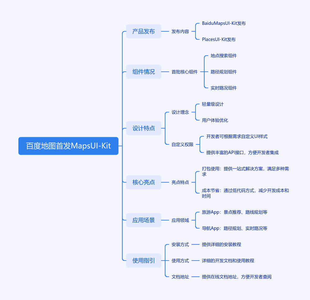 2026年2月10日,百度地图正式发布全新低代码、开箱即用的AI原生地图产品Baidu Maps UI-Kit,本期开放Places UI-Kit,后续将发布路线规划、导航等能力。Places UI-Kit能以组件化形式将百度地图原生交互界面装进产品,依托百度地图海量地点信息和用户交互验证,可构建专业直观的地点探索体验。其首批核心组件有地点详情和搜索组件,设计轻量,支持视觉和功能自定义。该产品支持“地图底图+UI”打包使用,能节省超70%前端开发资源,适用于旅游或本地生活App等,还提供了使用和安装方式及相关文档地址。
