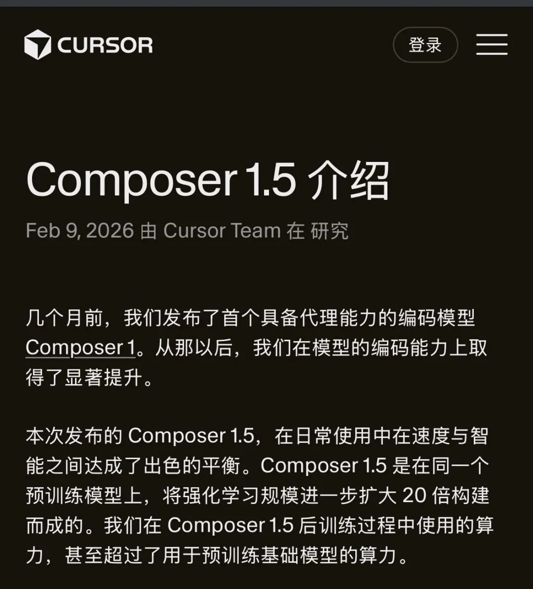 2026年2月9日,AI编程工具开发商Cursor发布旗舰编码模型Composer 1.5。其强化学习规模扩大20倍,后训练算力超预训练。该版本保持快速响应并提升智能,有“思考型”设计和自我总结能力。与同类产品相比,它在编码特定强化学习、代理能力等方面有优势,但缺乏独立公开基准验证,成本高、通用性不足且生态锁定。虽不是绝对最强,但适合深度代理复杂项目,若有独立基准上榜或挑战领先地位。