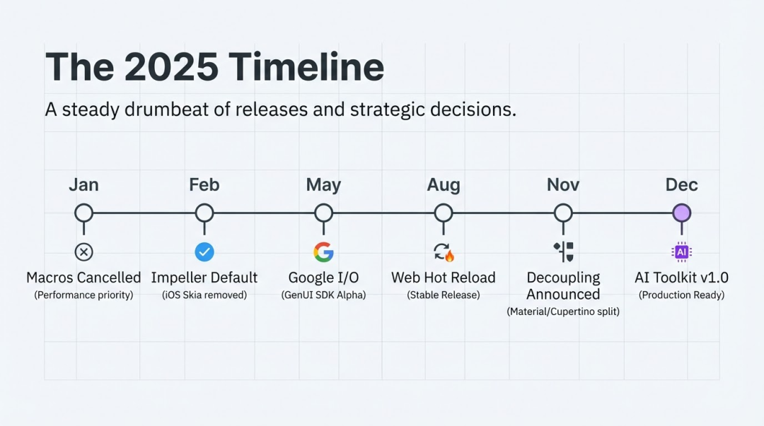 2026年2月25日,Flutter发布2026 Roadmap。2025年其基本完成Impeller移动端过渡,解决了复杂动画着色器编译卡顿问题,hotload支持到Web端,且在移动端和桌面端的使用率有所提升。2026年官方重点包括持续推进Impeller,完成Android平台迁移并移除旧版Skia后端,支持新系统版本,改进辅助功能;与社区框架合作,转正WebAssembly;在GenUI和AI方面,研究改进Dart语言以支持动态加载AI生成UI,与团队合作实现Dart支持,开发Dart Cloud Functions等;还计划改进Dart语法和编译性能,支持Git LFS。