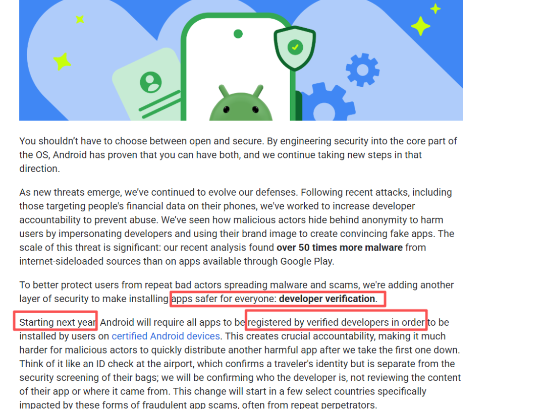 文章围绕Android 17适配和2026年Android禁止侧载展开。Android 17适配方面,涉及usesCleartextTraffic弃用、‘隐式URI grant’限制、键盘显示状态变化、后台音频收紧等多项变更,还针对targetSdk=37有新措施,如引入DeliQueue架构、收紧BAL、新增权限等。禁止侧载方面,2026年3月开发者身份验证开放,9月部分地区需验证开发者才可安装应用,2027年全球普及。谷歌称此举为提升安全,还为部分开发者构建新控制台,但开发者认证需提供个人信息,引发不便之感。