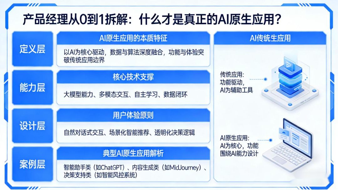 文章指出很多AI项目停留在表面创新,深度剖析AI原生本质。先区分AI增强与AI原生,前者AI是点缀,后者AI是核心。以“灵感旅行家”为例,阐述产品经理工作流重构,需求分析从“功能清单”到“场景意图池”,交互定义从“点击路径”到“多模态感知”,架构设计从“瀑布流页面”到“Agent编排”,交付物定义从“静态展示”到“实时生成的逻辑流”。最后给产品经理做AI原生应用提三条建议,包括拒绝“对话框依赖症”、拥抱“灰度需求”、别追求100%确定性。