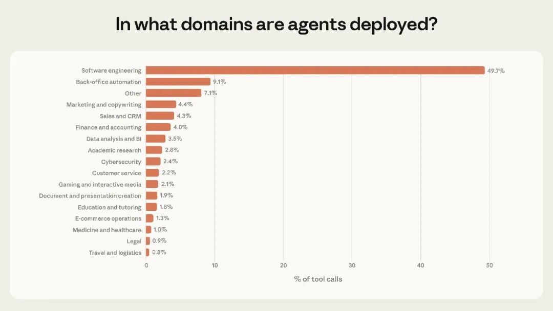 文章围绕AI agent除代码和客服外的爆发场景展开。Anthropic报告显示软件工程AI agent部署占比高,销售、金融等领域低。原因在于编程和客服数据易获取、反馈机制成熟。销售和金融领域数据分散、集成难、反馈循环长。不过,当前CRM和ERP供应商正开放数据和构建框架,Gartner预测到2026年底企业应用集成AI agent比例大幅上升。SaaStr的AI agent已带来实际业务成果,如自主完成交易。作者认为应把握时机,不同规模公司各有优劣,还会催生新职业技能需求。